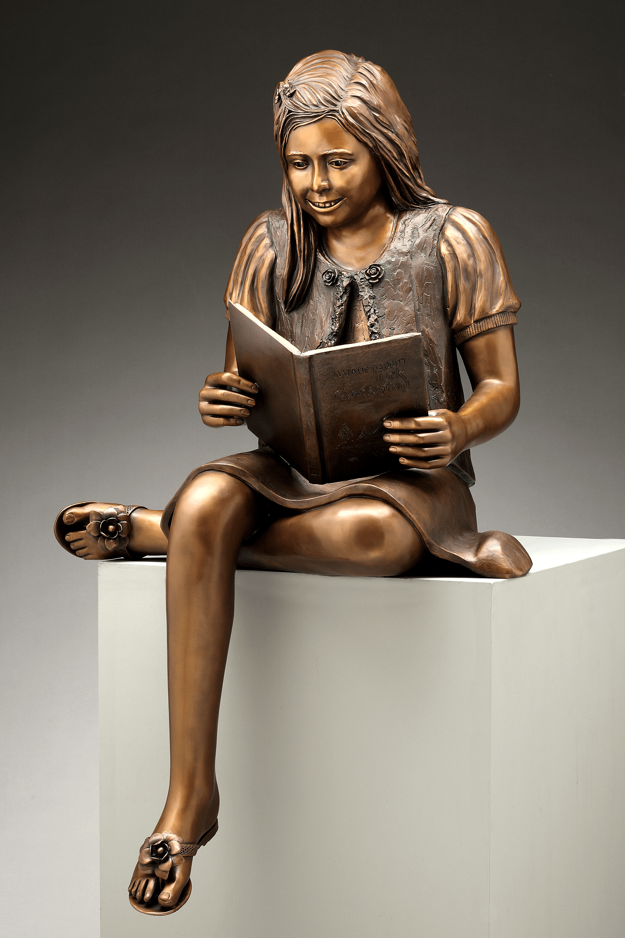photograph Sarah she was 10 ½ years old, with beautiful long red hair with golden highlights. We asked her what she liked to do when she was sitting outdoors in the beautiful garden area behind her parents’ home. Sarah quickly answered: “Read a great book!” So, we had her go get her favorite book, which was author Natalie Babbitt’s “Tuck Everlasting”. If you look closely you will see Sarah’s sculpture is reading that very book.